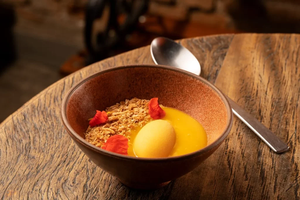 - Para montar o prato, disponha o purê de manga e o crocante ao canto, em cima do purê. Coloque a quenelle de sorbet meio afundado no purê ao lado do crocante e decore com pétalas de flor.