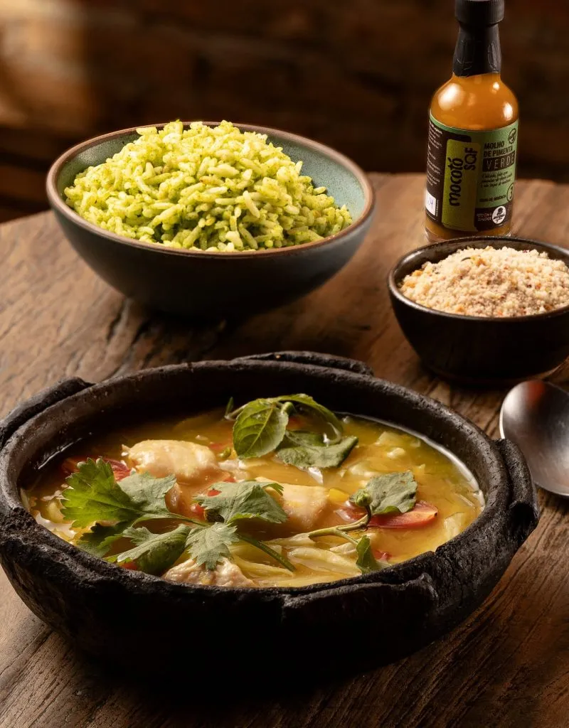 • Coloque o arroz, que está no banho maria, no prato e a farofa, em temperatura ambiente. E a caldeirada finalizada com folhas de coentro e jambu;